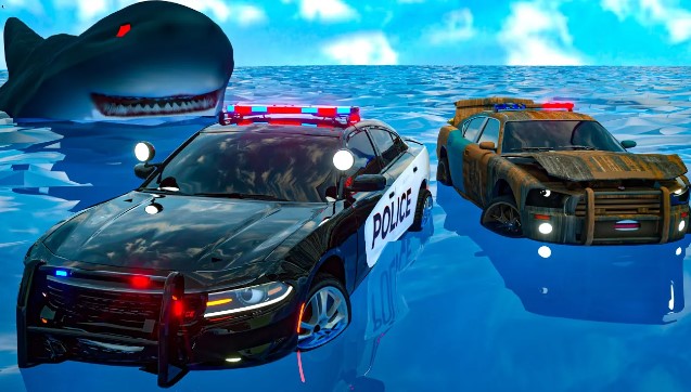 کارتون ماشین های قهرمان شهر : حمله کوسه به ماشین پلیس در زیر آب : هلی کوپتر پلیس