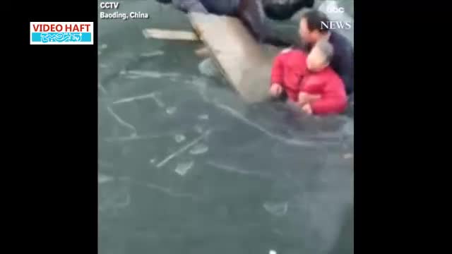 نجات پیرزن چینی از غرقشدن در رودخانه یخزده