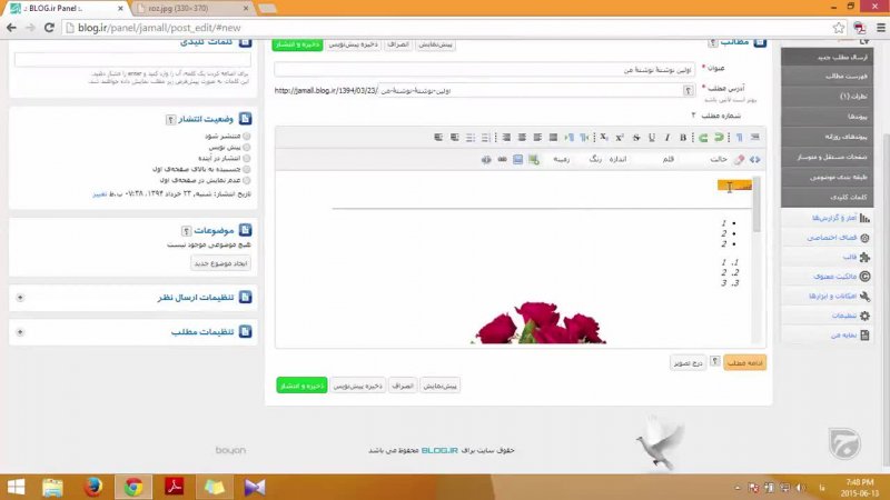 در این ویدیو به به مبحث ارسال مطلب جدید در سامانه Blog.ir می پردازیم. تمامی گزینه ها و قسمت های ارسال یک نوشته توضیح داده شده و حتی با طریقه قرار دادن تصویر و دیگر اجزا یک نوشته کاملا آشنا خواهید شد. در حالت HD تماشا کنید. پسندیدن یادتان نرود! Bloging.ir