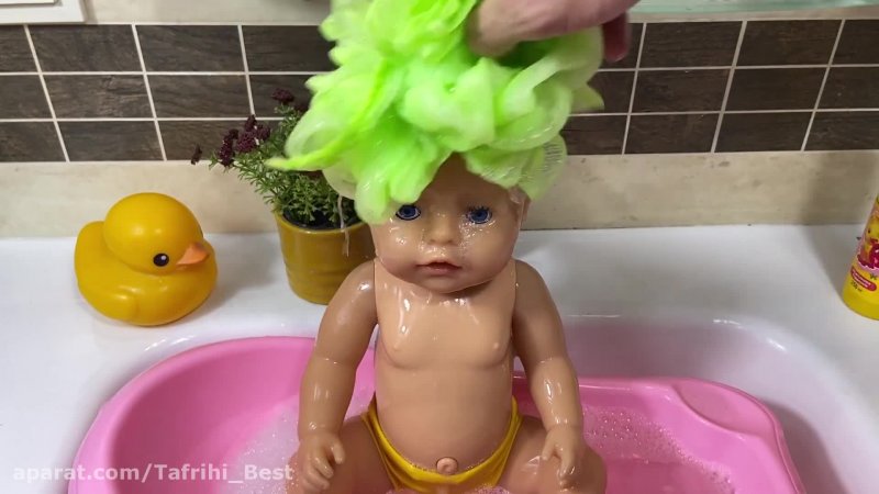 عروسک بیبی بورن در یک دستشویی با فوم حمام می کند
