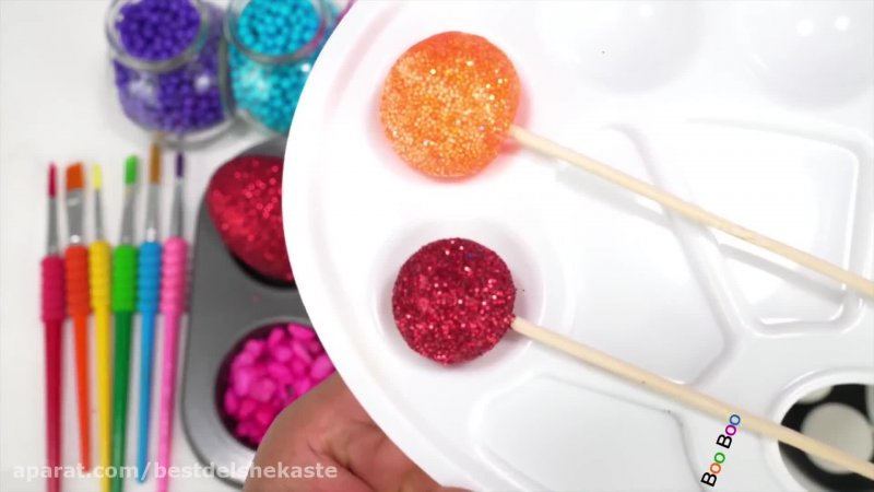 ویدیوی رضایت بخش نحوه درست کردن آب نبات آبنبات چوبی رنگین کمانی با توپ های براق و توپ های استرس برش ASMR