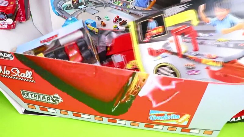 ماشین بازی کودکانه همراه با کامیون مک که داخل آن ماشین های مک کویین و دیگر وسایل نقلیه وجود داردمخصوصا انواع ماشین مسابقه ای مک کویین که در انیمیشن ماشین ها آن را مشاهده کردیم.
