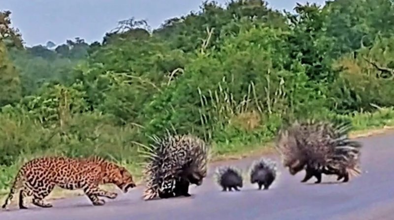 محافظت دو جوجه تیغی از بچه هایشان در برابر حمله پلنگ لئوپارد.