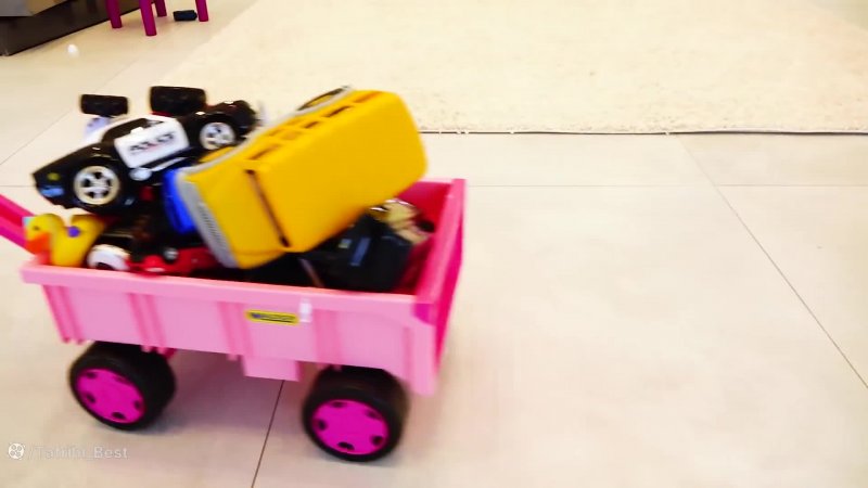 ولاد و نیکیتا سوار بر بیل مکانیکی با اسباب بازی ها بازی می کنند