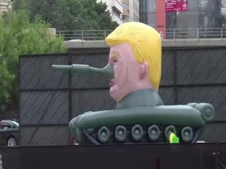 لبنانیها ماکتی بادکنکی به شکل تانک و ترامپ در منطقهای جنگ زده در جنوب بیروت ساخته و آن را در کنار ساختمانهای ویران باقیمانده از جنگ قرار داده اند.