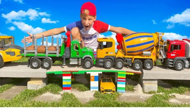 فیلم ماشین بازی کودکانه جدید :: ماشین کامیون - میکسر سیمان و افتادن از روی پل