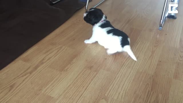 این توله سگ بامزه و دوست داشتنی رو ببینین چجوری رو کف زمین لیز می خوره، یکی هم نیس کمکش کنه!