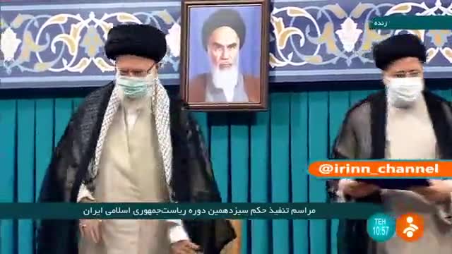 لحظه اعطای حکم تنفیذ سیزدهمین دوره ریاست جمهوری اسلامی ایران به سید ابراهیم رئیسی توسط رهبر انقلاب