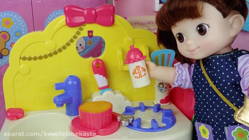عروسک کودک آشپزخانه خانه و یخچال در حال پخت و پز غذا اسباب بازی داستان بازی - ToyMong TV 토이몽