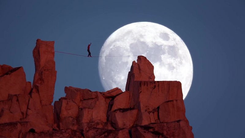 تصاویر فوق العاده از ابر ماه و حرکات آکروباتیک فردی که روی طناب راه می رود