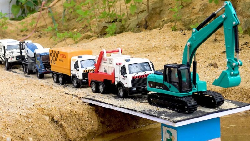ماشین بازی کودکانه نجات ماشین های سنگین ساخت و ساز توسط جرثقیل و پر کردن گودال