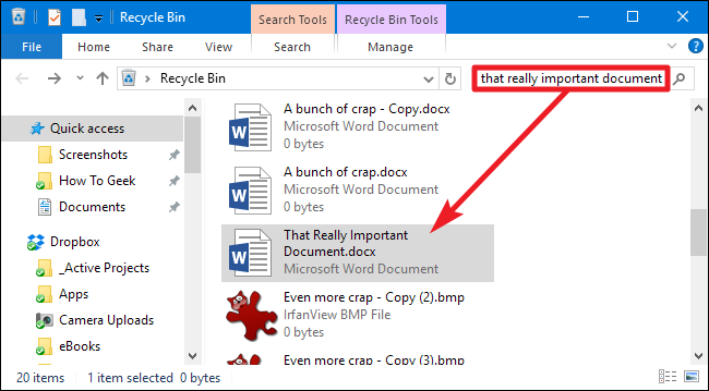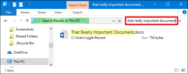 اول از همه ،اگر هنوز دقیقا نمی دانید که فایل مورد نظر واقعا پاک شده و یا خیر بهتر است ابتدا به دنبال آن بگردید. بنابراین نام فایل را در کادر جستجو در فایل اکسپلورر وارد کنید و سپس اینتر بزنید.