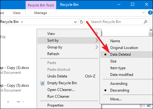 در فایل اکسپلورر بر روی “View” کلیک کنید. یک منو باز خواهد شد. در این منو بر روی “Sort By” و سپس “Date Deleted” کلیک کنید. به این ترتیب فایل ها بر اساس تاریخی که پاک شده اند مرتب خواهند شد.