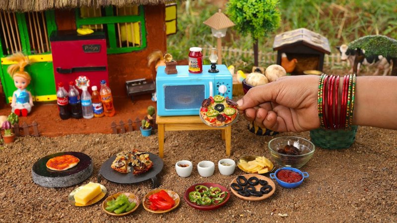 آشپزی مینیاتوری واقعی در طبیعت و پخت پیتزای خوشمزه در تنور.