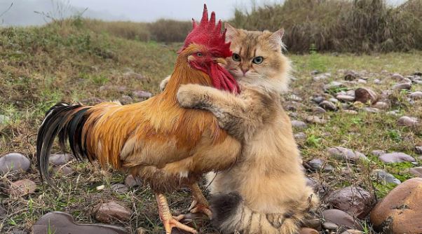 ببینید این گربه بامزه چجوری مواظب خروس مزرعه اس !
