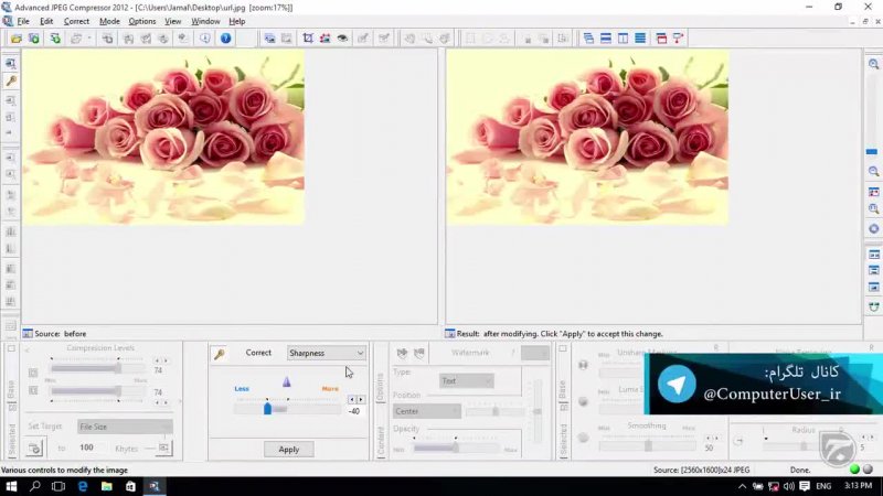 جعبه ای در پایین نرم افزار Advanced JPEG Compressor با نام Correct به معنای اصلاح وجود دارد که اعمال اصلاحی و ویرایشی را می توان روی عکس می توان انجام داد. اعمالی مثل اصلاح رنگ تمایز رنگ روشنایی و ... در این ویدیو به این قسمت از نرم افزار Advanced JPEG Compressor آشنا می شویم.