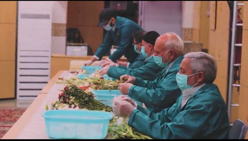 مراحل آمادهسازی و بستهبندی گلهای متبرک فوق ضریح مطهر توسط خدمتگزاران شمیم رضوان