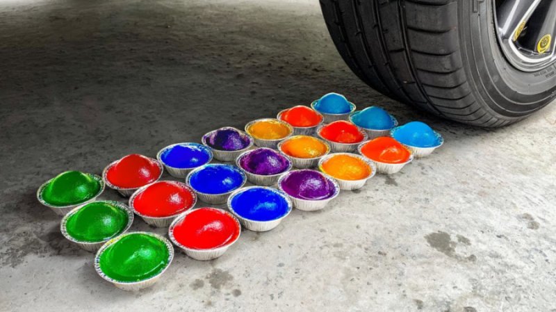 شکلات های رنگارنگ را در مقابل ماشین در مقابل ژله رنگارنگ آزمایش کنید خرد کردن چیزهای ترد و نرم با ماشین!