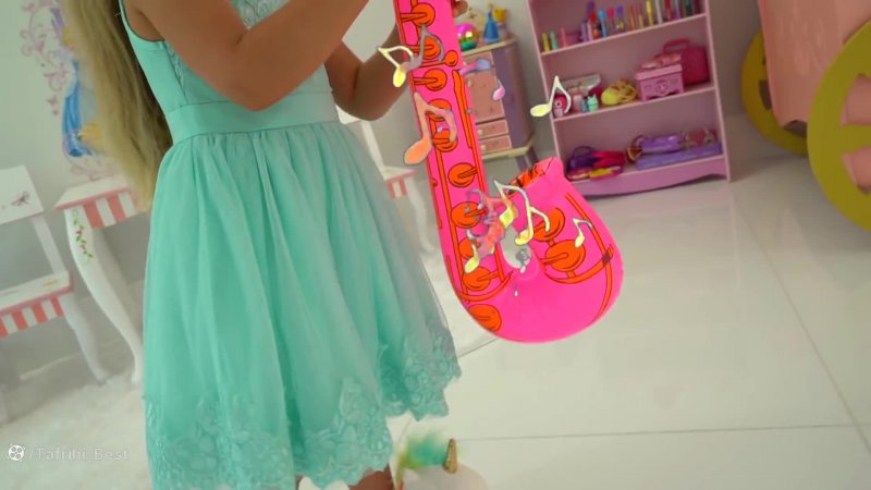 دایانا و روما وانمود می کنند که نمایش استعدادهای درخشان با ابزارهای موسیقی اسباب بازی برای کودکان بازی می کنند