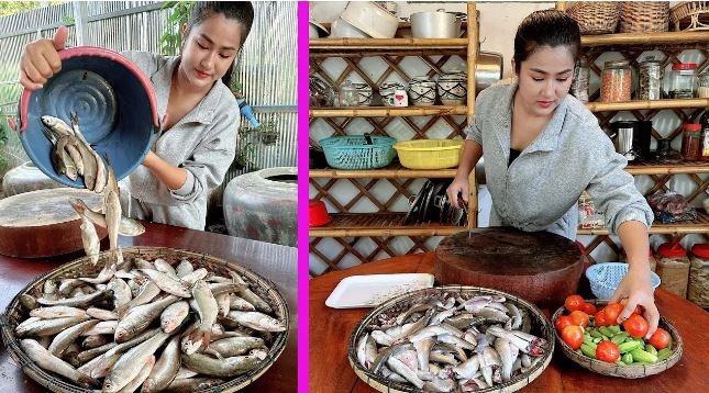 آشپزی روستایی زن چینی با ماهی رودخانه