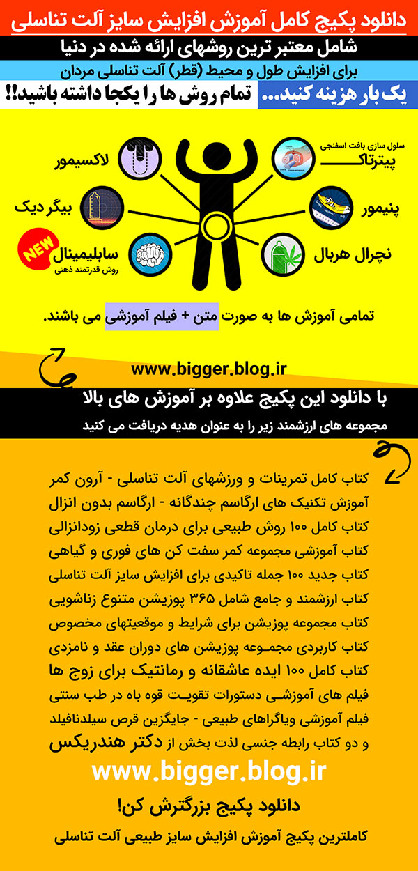 دانلود تمام روش های افزایش سایز آلت: پیترتاک لاکسیمور**پنیموربیگر دیکنچرال هربال و سابلیمینال** به صورت یکجا. هر کدام از آموزش ها شامل کتاب عکس ها و فیلم های آموزشی می باشد که به صورت یکجا در یک فایل فشرده دانلود می کنید.. و البته علاوه بر آموزش کامل این روش ها فایلهای آموزشی دیگری را هم به صورت هدیه دریافت می کنید: