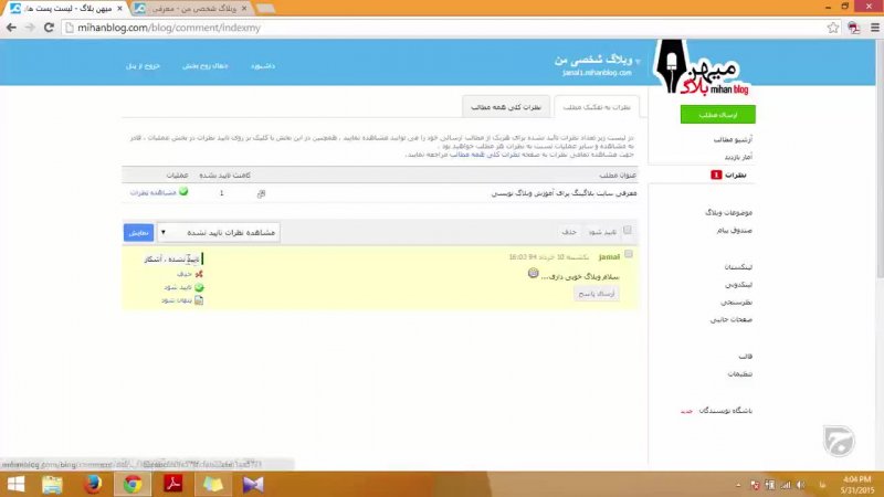 در این قسمت از ویدیوهای آموزش وبلاگ نویسی در میهن بلاگ به بخش نظرات وبلاگ می رسیم که برای خواندن پاسخ دادن و به طور کلی مدیریت نظرات خوانندگان وبلاگ کاربر د دارد.