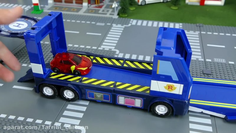 کامیون آتش نشانی آزمایشی لگو و کامیون هیولا. وسایل نقلیه اسباب بازی برای کودکان