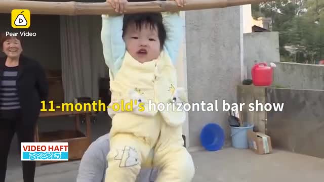 ▪️ پدر چینی دختر 11 ماههاش را برای آویزان شدن از میله تمرین داده و تا الان رکورد 51 ثانیه را ثبت کرده است.
