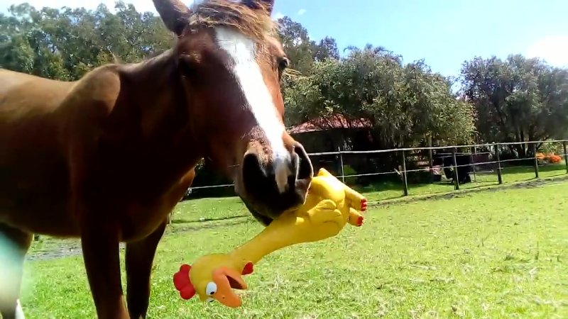 اسبی که از صدای اسباب بازی اش لذت می برد بی وقفه آن را گاز می گیرد و به زمین می مالد تا صدایش را بشنود.