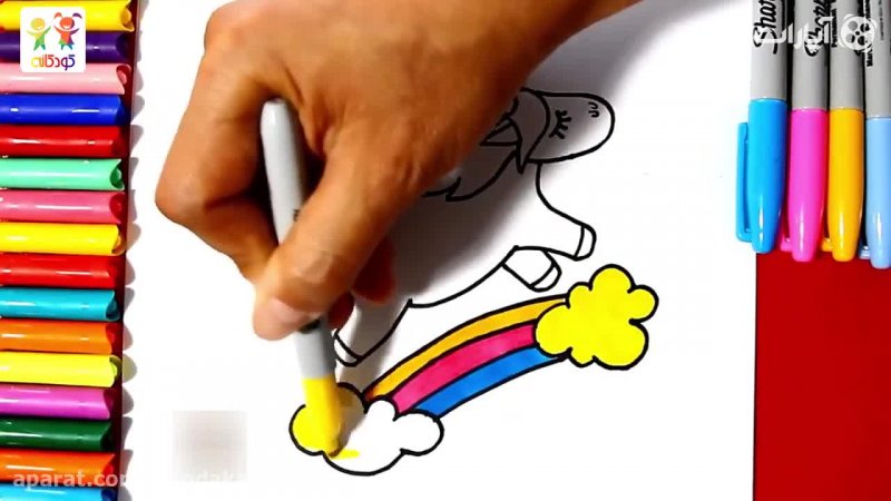 آموزش نقاشی کودکان - اسب تک شاخ آبی در حال پرواز تو آسمون رنگین کمونی