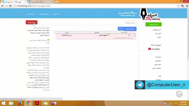 بخش دیگری که در پیشخوان میهن بلاگ وجود دارد صندوق پیام نام دارد که پیام های بازدید کنندگان وبلاگ شما همچنین دیگر وبلاگ نویسان موجود در سامانه مین بلاگ و مدیران خود میهن بلاگ را از این طریق می توانید دریافت کنید. توضیحات بیشتر را حتما از طریق مشاهده این ویدیو به دست آورید.
